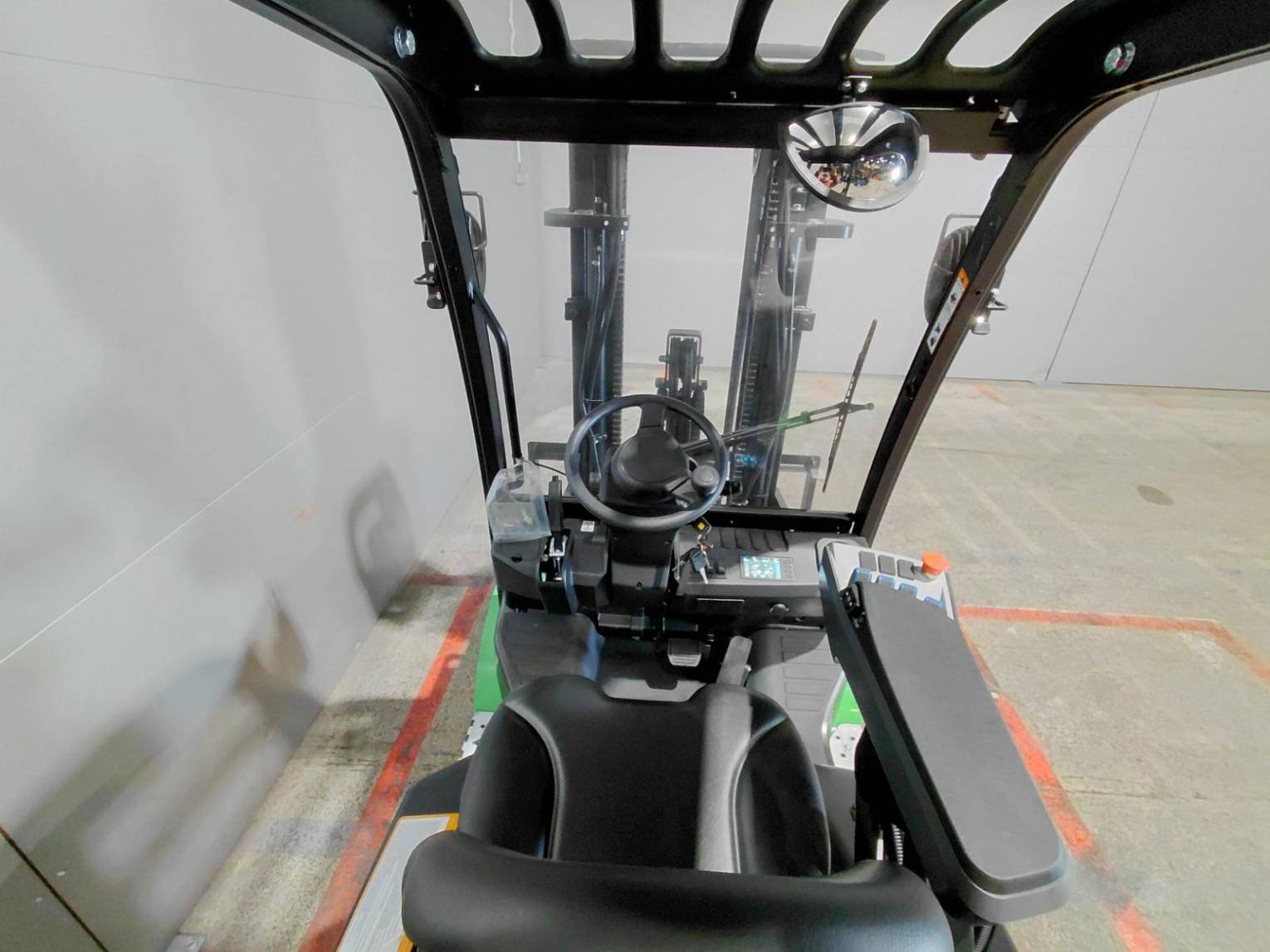 Covered roof 4th valve inlet on fork carriage Parabrezza anteriore LED road lighting Lithium battery Lithium battery charger Griglia protezione carico Mini-lever Panoramic rearview mirror Rear blue spot Rear work lights Reported sideshift Reverse signal Strobe beacon USB plug |
